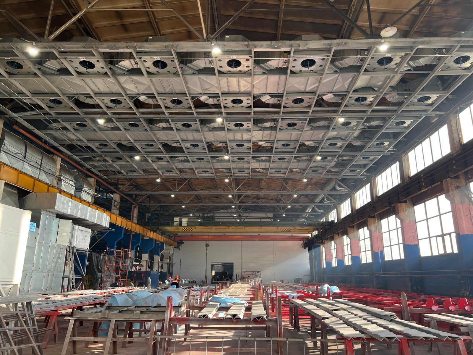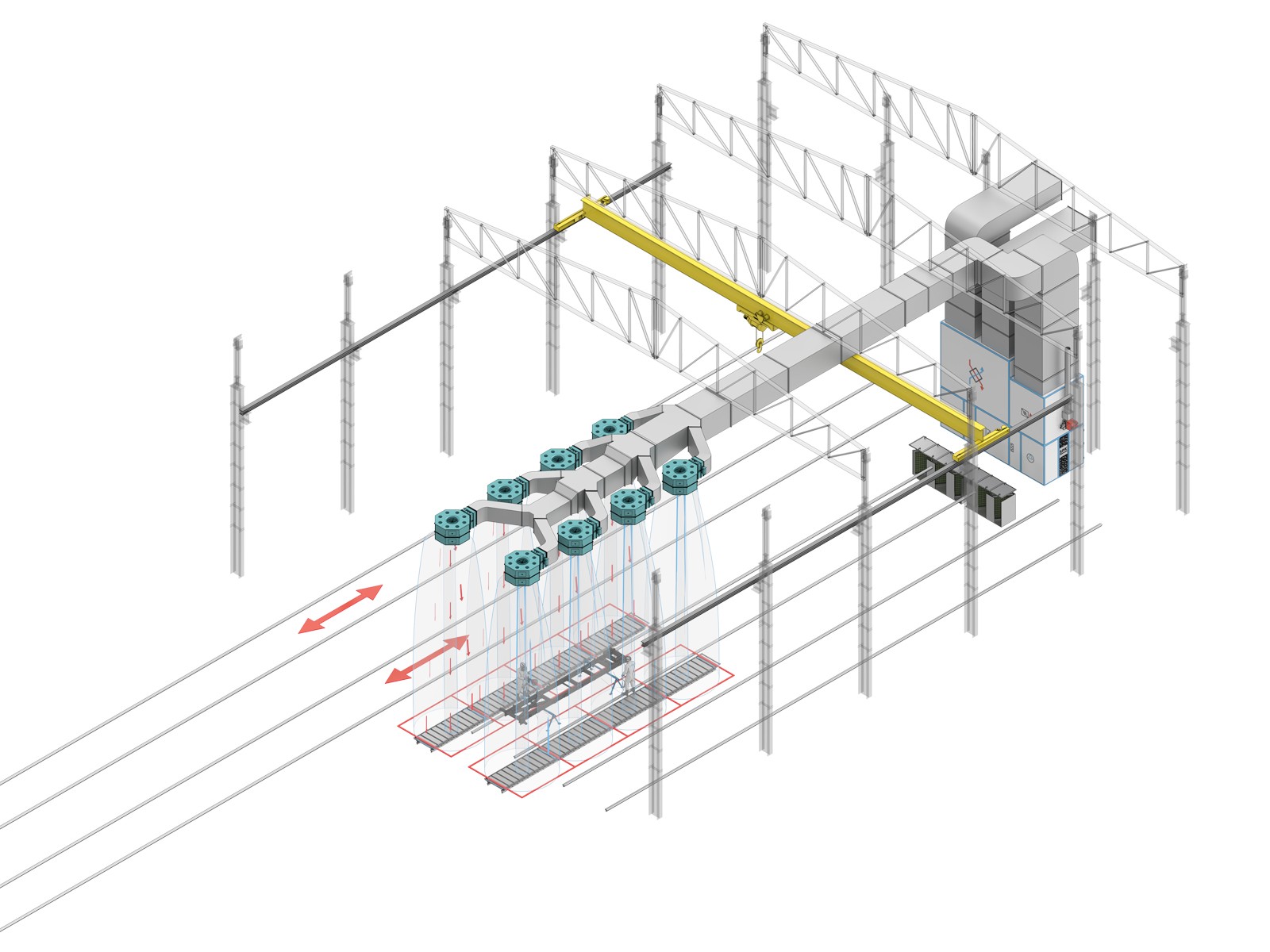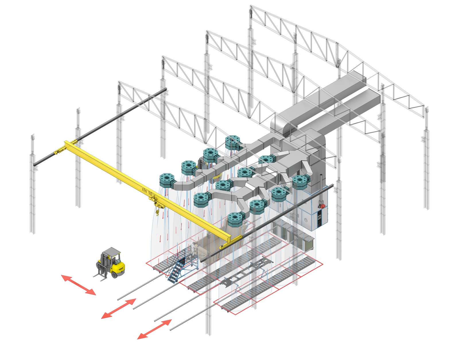 При проектировании поддерживающих конструкций воздуховодов и сопел важно учитывать, что масса одного сопла составляет около 280 кг, а нагрузка на воздуховоды — 65 кг/м². Вес металлоконструкций рассчитывается отдельно. Расположение сопел, воздуховодов и оборудования выполнено в виде схем и в масштабе согласно проектным визуализациям.