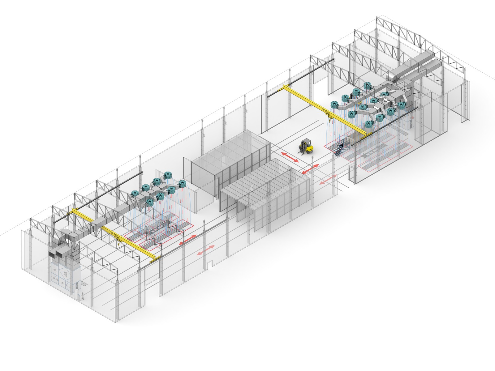 - Воздушные дальнобойные сопла, размещенные под потолком, формируют равномерный ламинарный поток воздуха в зоне подготовки и нанесения ЛКМ на изделия;