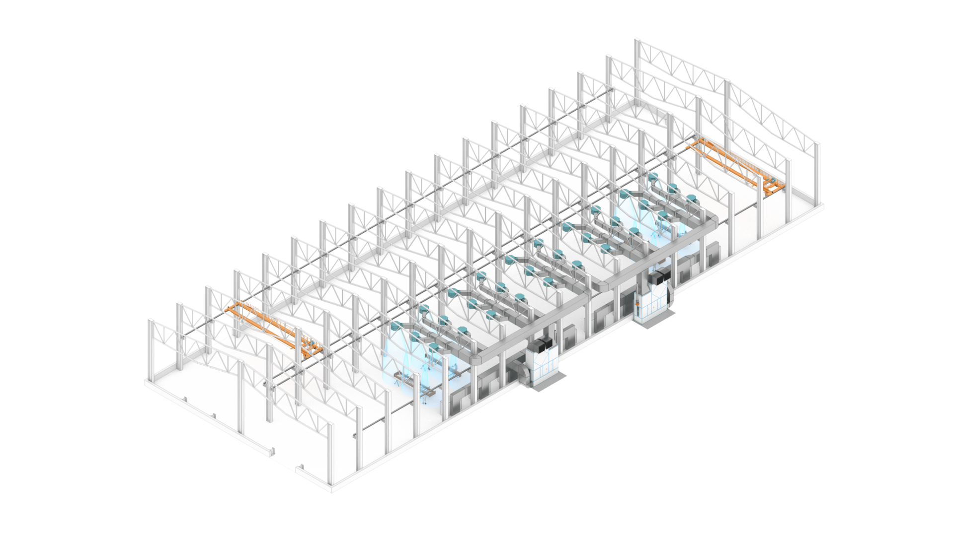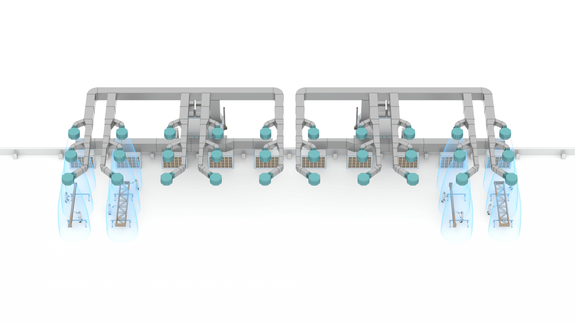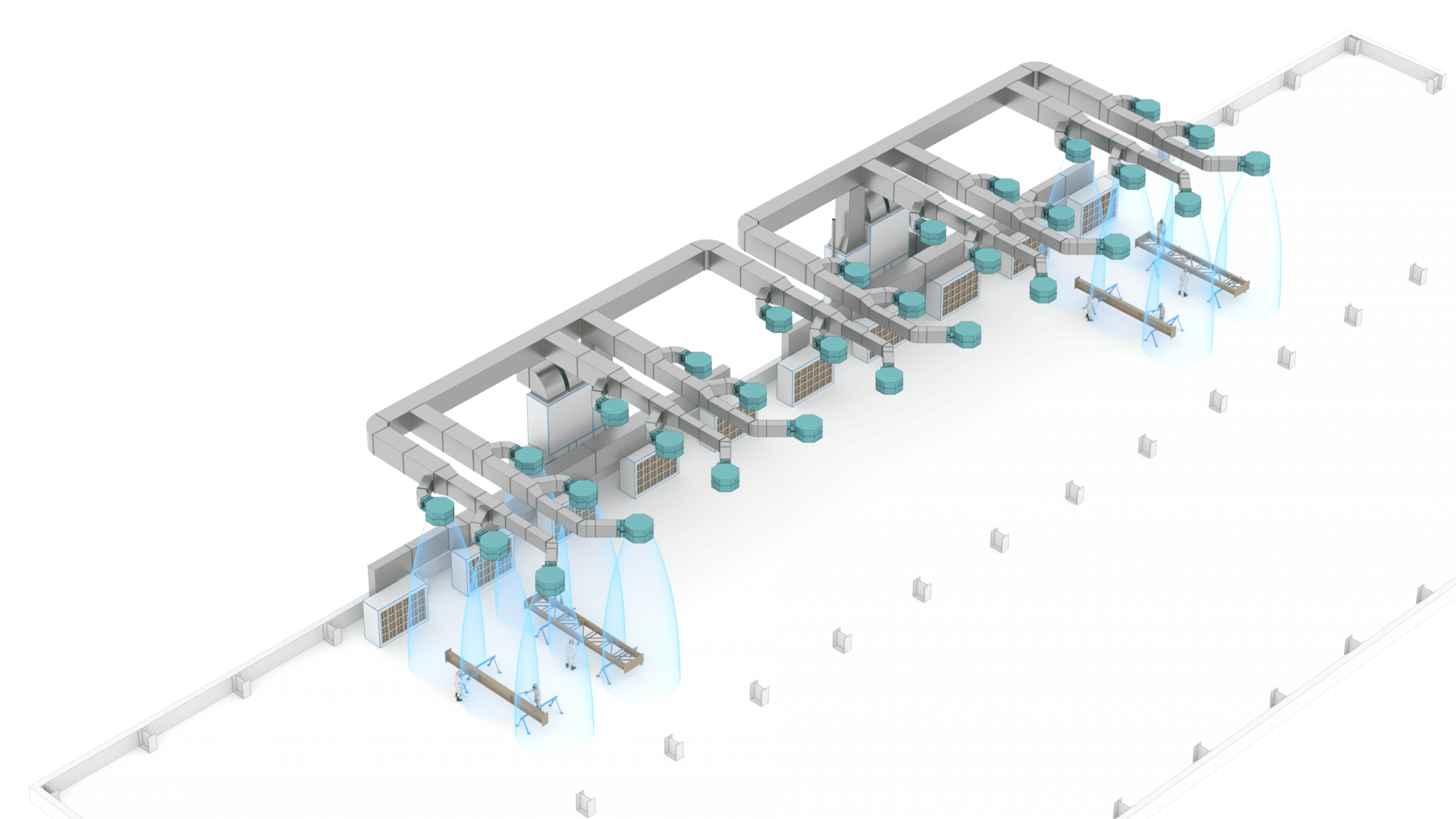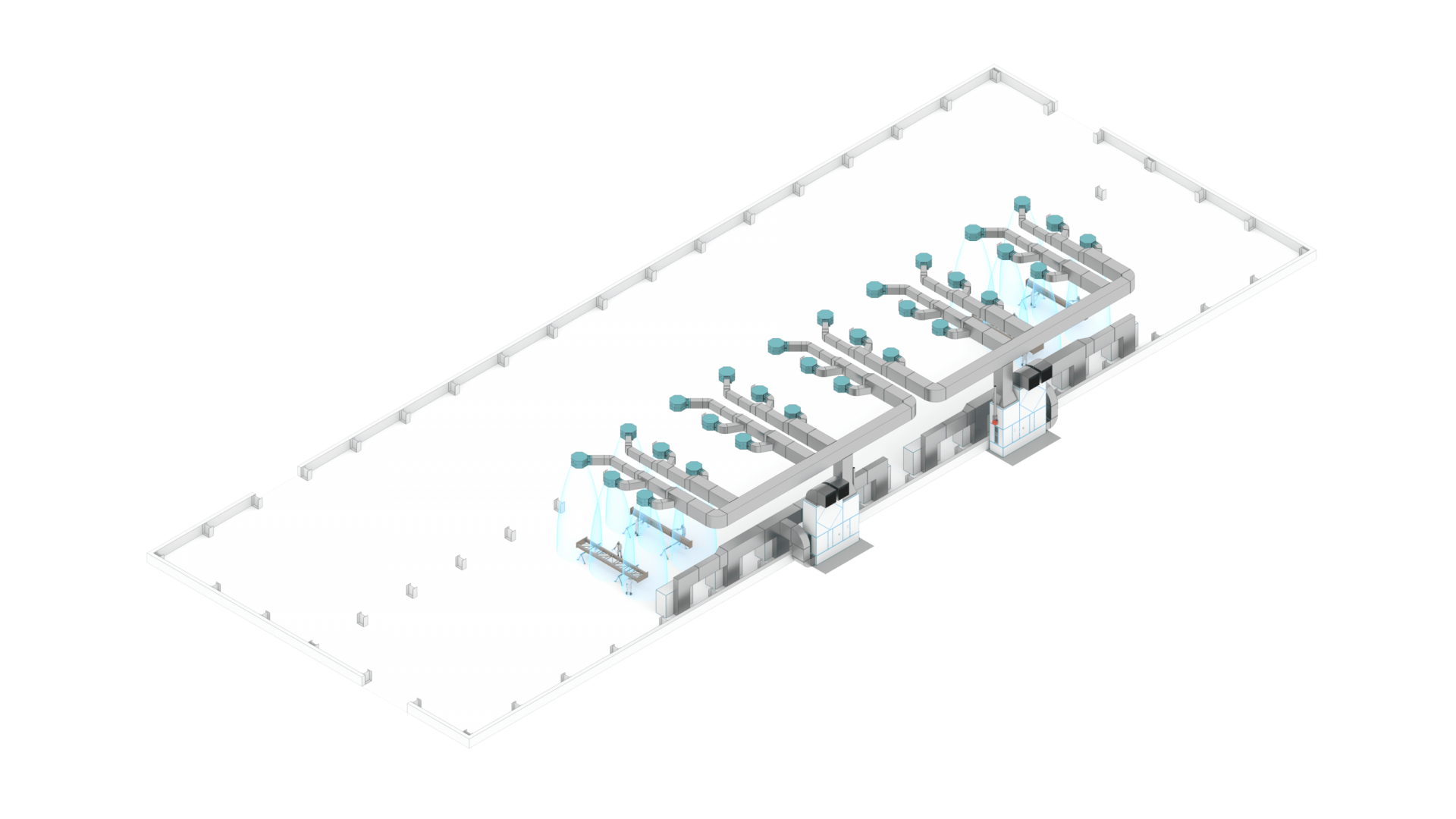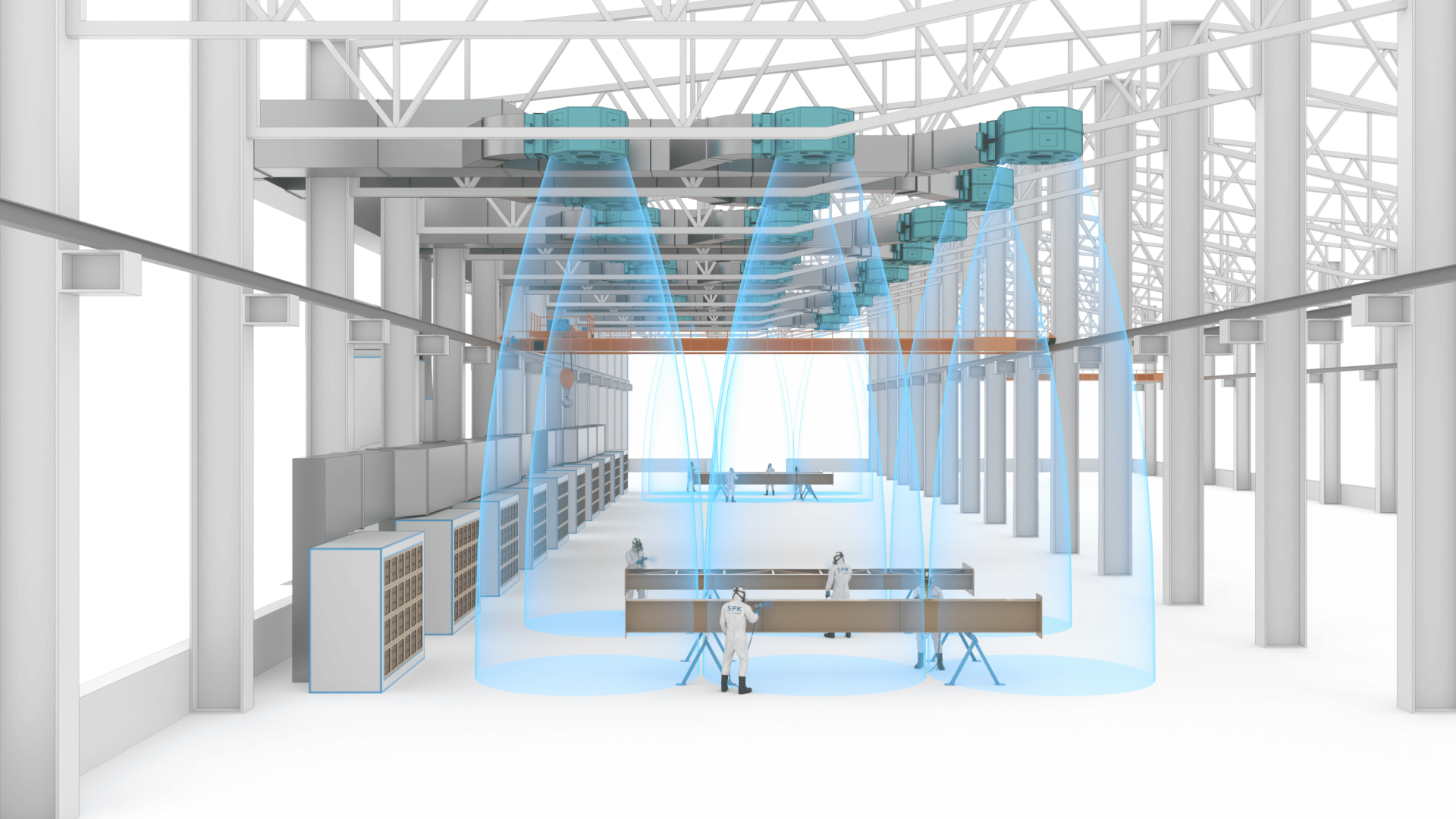 Ключевым компонентом системы является приточно-вытяжной агрегат SPK-VU-36, выполненный в искробезопасном исполнении, с двигателями взрывозащищенного типа и прямым приводом вентиляторов, рассчитанный на воздухообмен 36 000 м³/ч, включающий две секции — для приточного и вытяжного воздуха — со средствами фильтрации G4, по два комплекта.