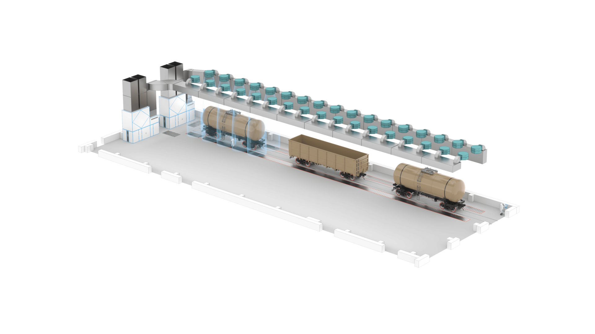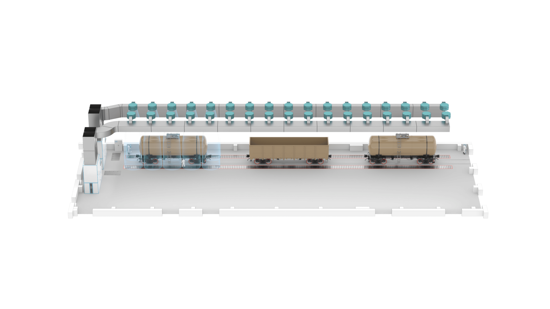 Область открытой окраски предназначена для безопасного нанесения краски на изделия внутри сектора, которые размещаются под группой воздушных сопел, обеспечивающих окраску с всех сторон. Обеспечивается свободный проезд для стремянок и проход для персонала.