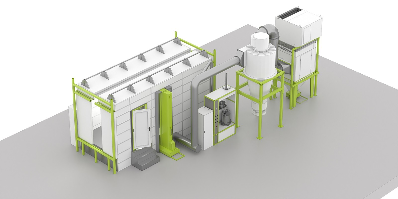 - Камера автоматической порошковой окраски с системой рекуперации, включающая вентилятор, фильтры и циклон — 1 устройство.