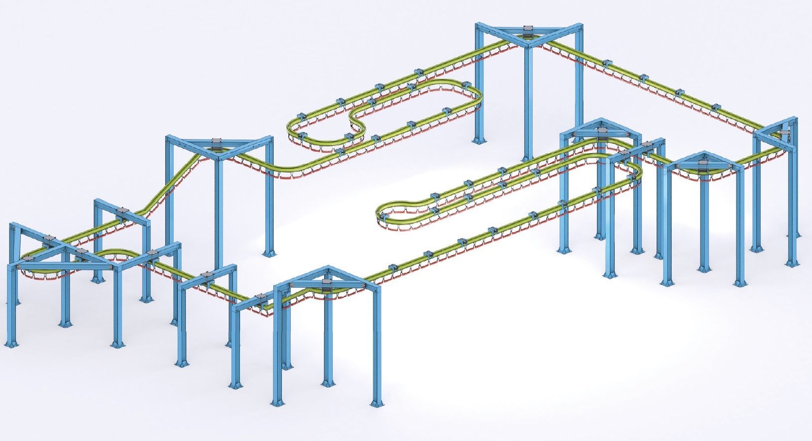 Этот вид конвейера представляет собой однажды подвешенную рельсовую систему специального профиля, изготовленную из высокопрочной и износостойкой стали. Внутри рельса движется непрерывная бипланарная цепь. Основную нагрузку несут вертикальные опорные элементы, а горизонтальные подшипники обеспечивают возможность обхода углов при поворотах в горизонтальной плоскости.