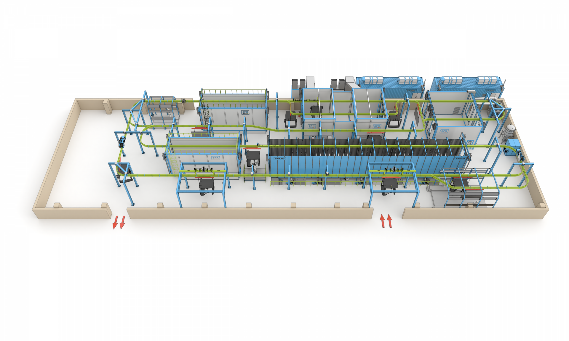Линия окраски кабин SPK предназначена для подготовки поверхности, нанесения краски и сушки кабин, капотных систем и баков. Она включает следующие компоненты: