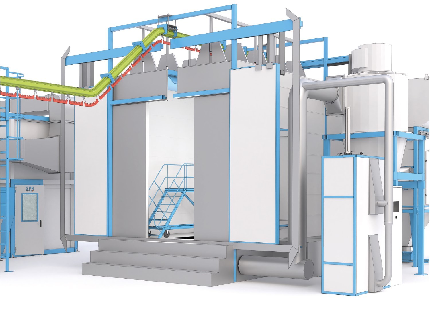 - Двухпостовая камера нанесения порошковой краски с размерами 7600 × 2600 × 4100 мм.