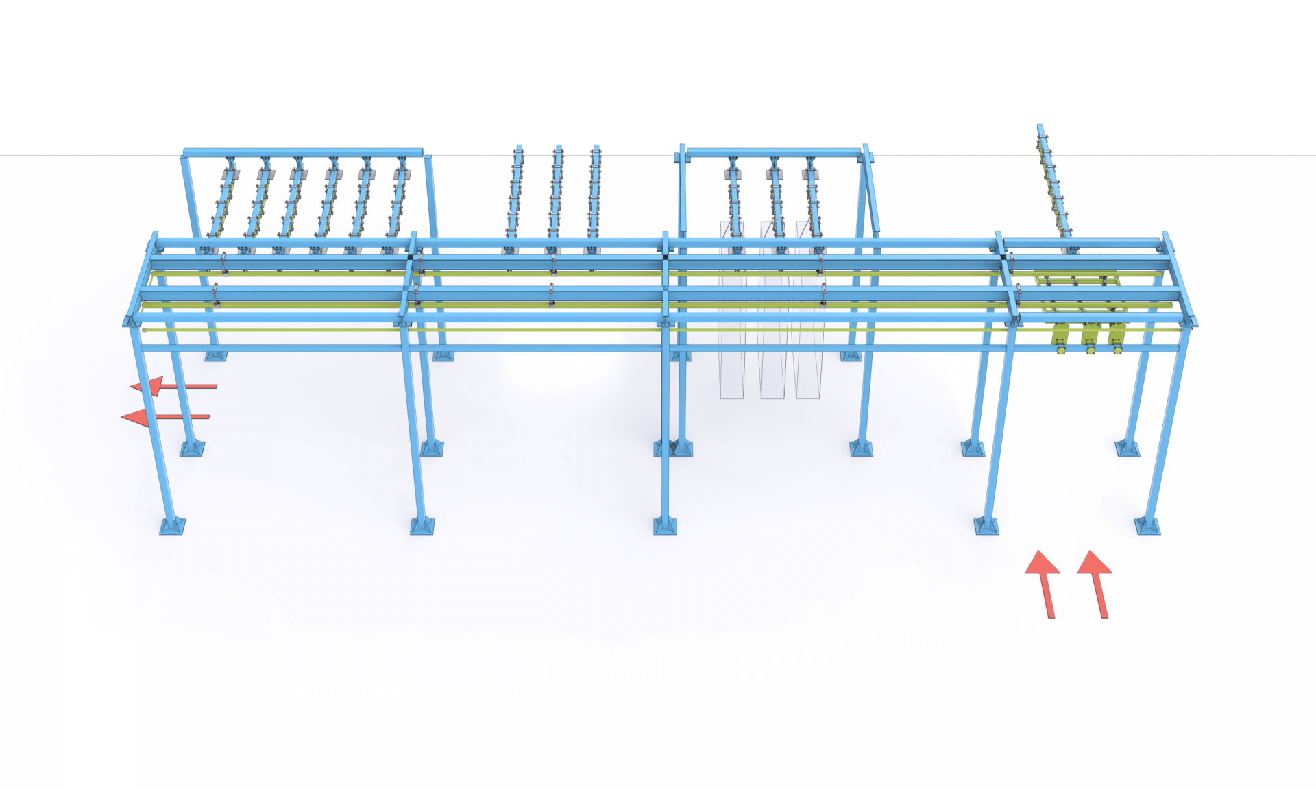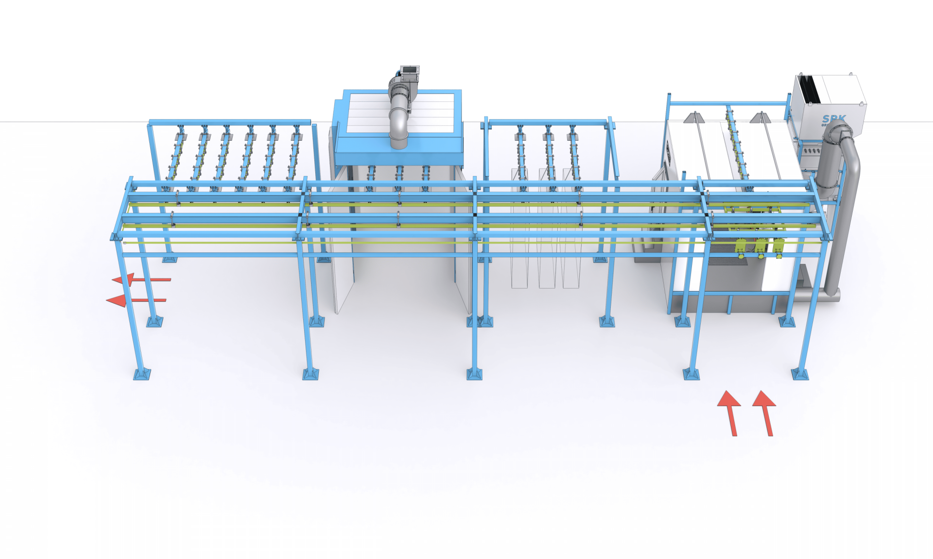 Ручная транспортная система: Транспортировка осуществляется вручную без перевешивания, включает системы накопителей, рельсы и траверсы для подвешивания изделий. В состав входит продольно-поперечный подвесной конвейер, на котором изделия по очереди окрашиваются, накапливаются, проходят цикл полимеризации, охлаждаются и разгружаются.