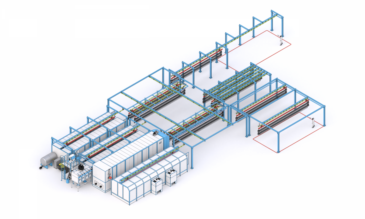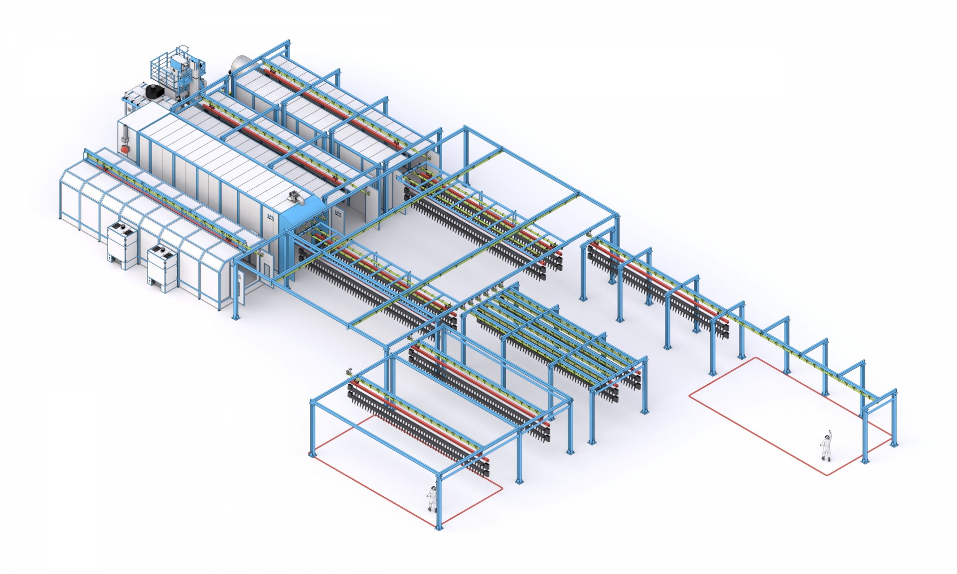 Конвейерная линия предназначена для обработки деталей сельскохозяйственной техники методом дробеструйной очистки, последующей окраски порошковыми материалами, полимеризации покрытия и последующего охлаждения. Максимальные габариты обрабатываемых изделий составляют 12 000 x 2 210 x 683 мм, а вес — до 1500 кг. В смену (8 часов) позволяет обработать 4 комплекта деталей.