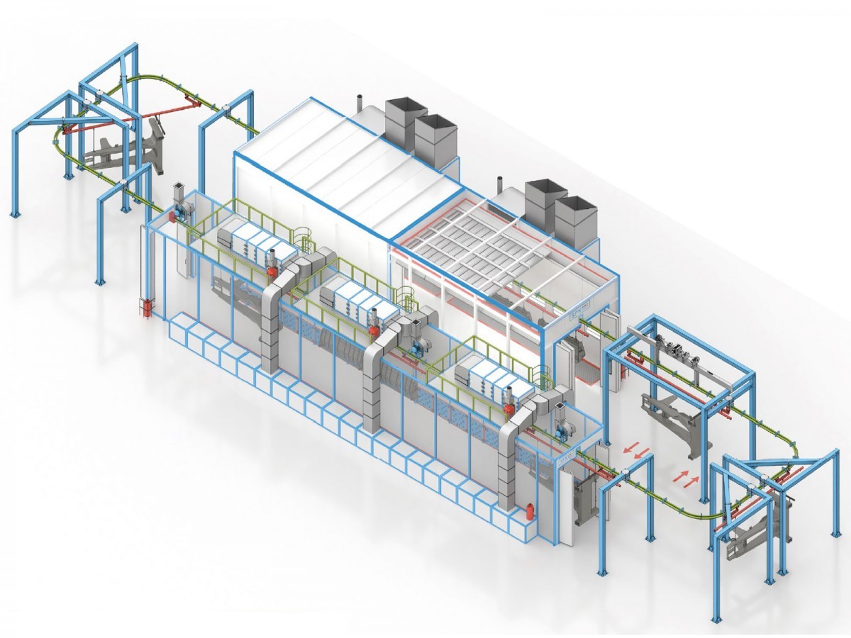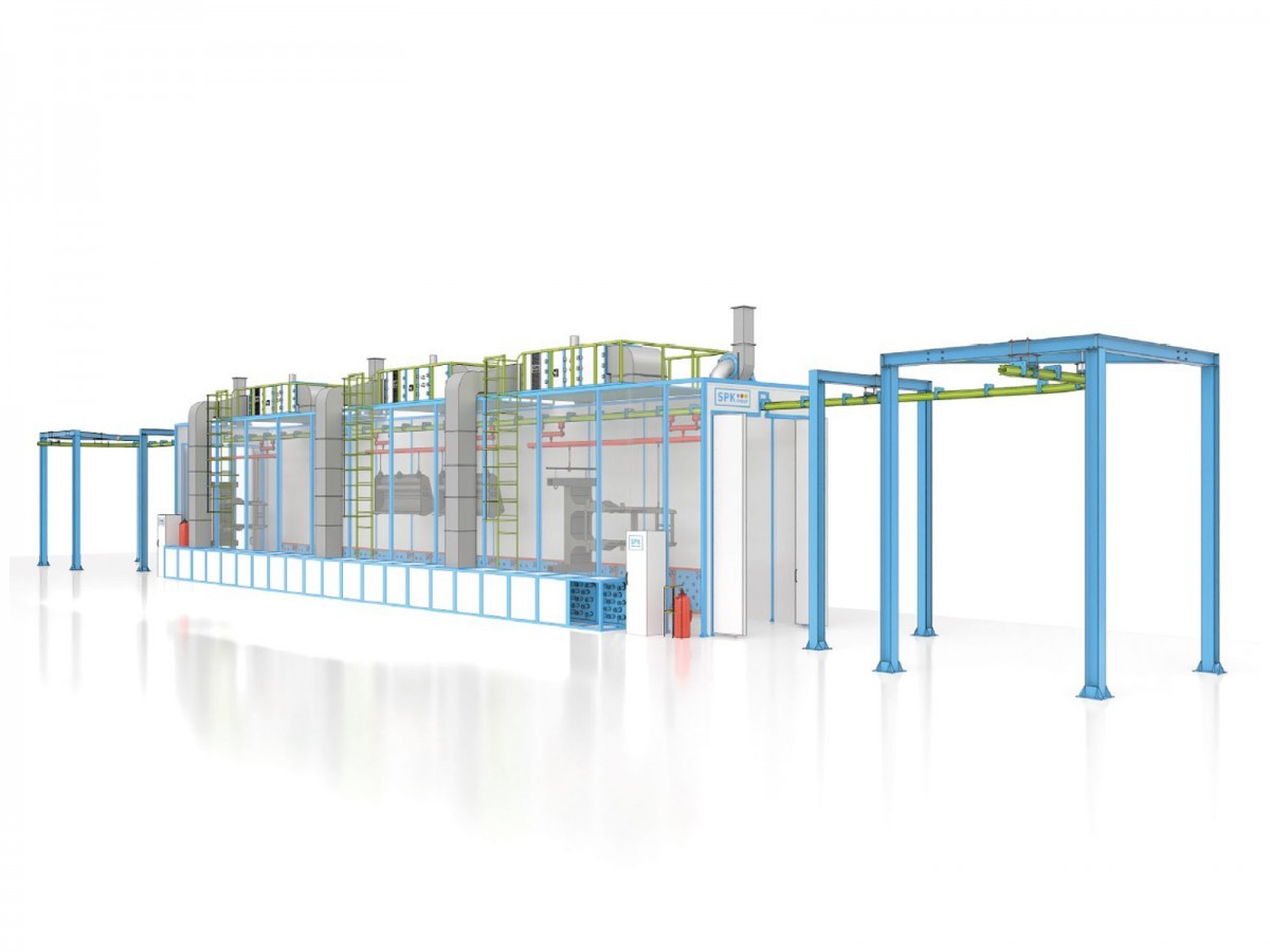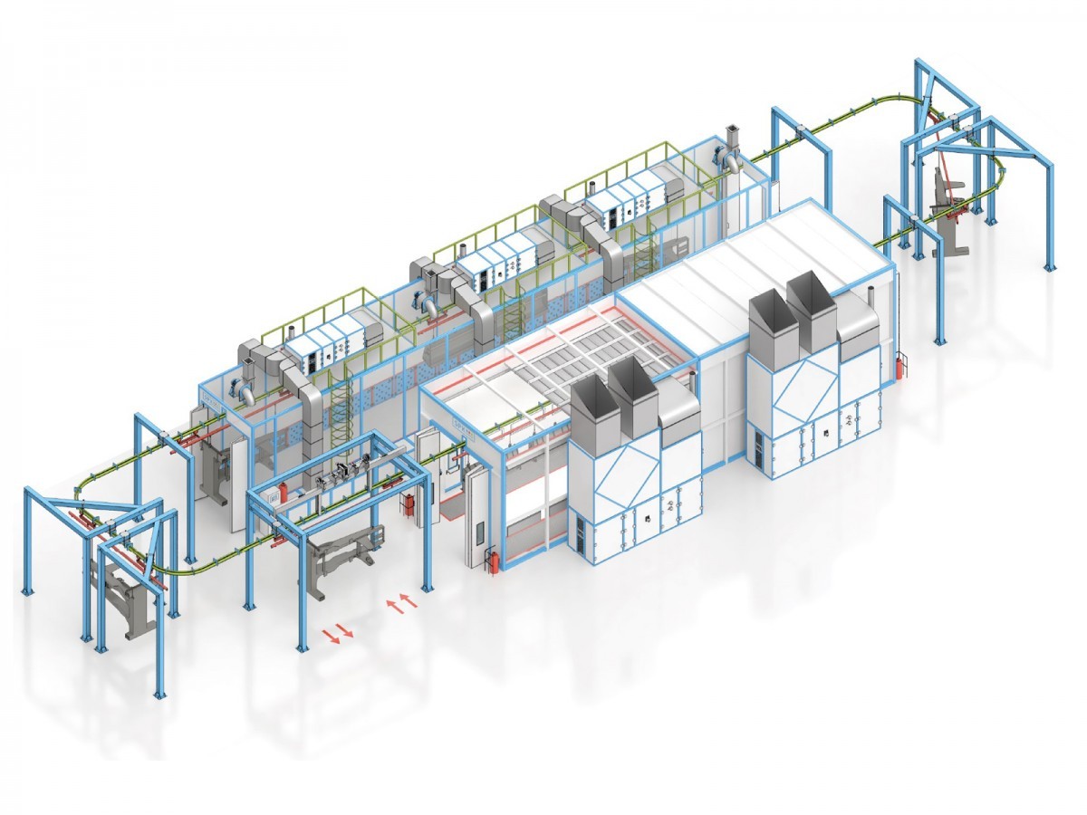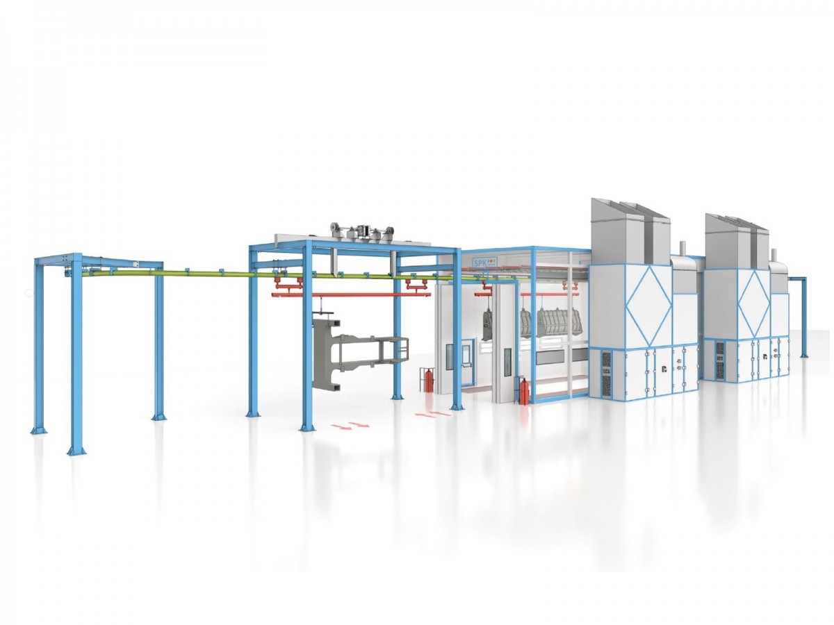 Окрасочно-сушильная камера модели SPK-СCB-19.5.5 (двухсекционная) Конструкция: выполнена на металлическом каркасе с порошковым покрытием и утеплена сэндвич-панелями толщиной 80 мм. Размеры каждой секции составляют 9500 мм по длине, 4600 мм по ширине и 5000 мм по высоте. Ворота: складные, автоматические, размером 3500×4300 мм. Встроены две сервисные двери с системой антипаника (по 800×2000 мм). Разделяющая секция оснащена автоматическими складными воротами (3500×4300 мм). Оснащение включает взрывозащищённые светодиодные светильники для верхней и боковой подсветки. В системе вентиляции предусмотрены потолочные фильтры тонкой очистки и стекловолоконные краскоостанавливающие фильтры класса G3. Вентиляция осуществляется поддувными взрывозащищёнными вентиляторами (2 шт., расход 35 000 м³/ч), с рекуператором тепла, газовыми теплообменниками, горелками и мультиблоками. Управление автоматизировано: система контроля, сенсорные панели, газоанализаторы и автоматическая пожарная система.