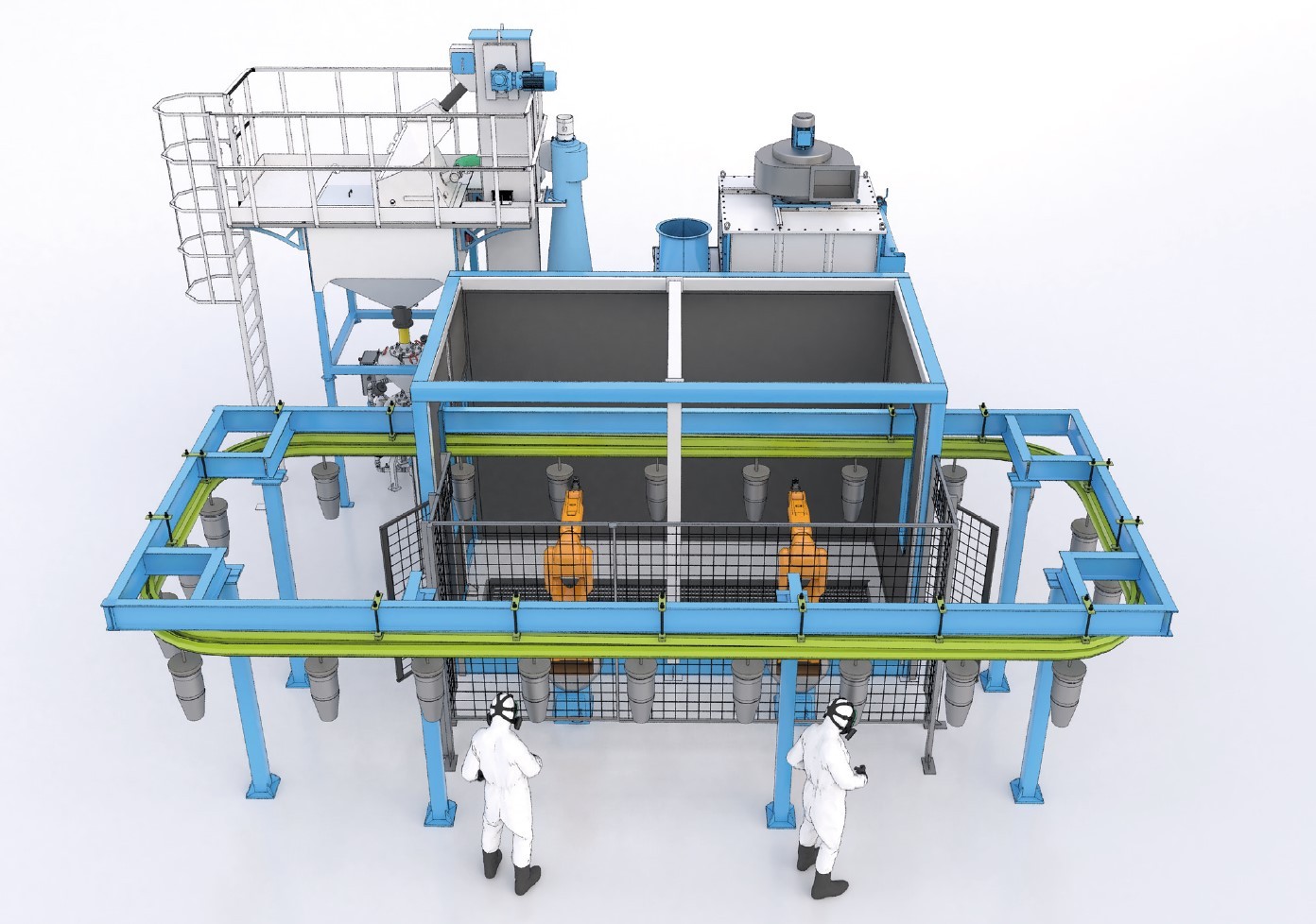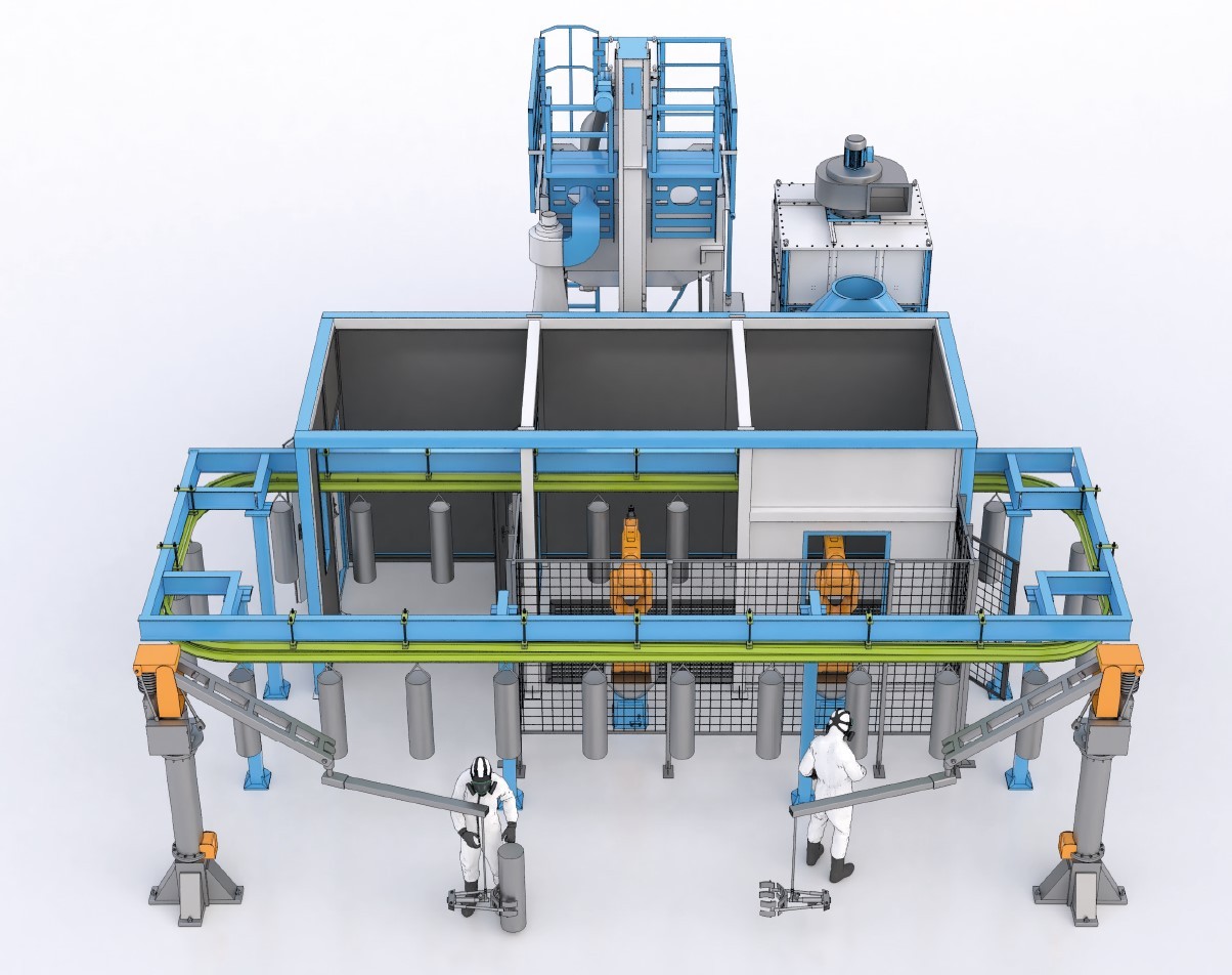 В транспортировке абразива участвуют продольные и поперечные конвейеры. Для подачи абразива в камере применяется двухпостовой напорный агрегат SPK, который обеспечивает одновременное и бесперебойное питание двух дробеструйных сопел. Управление процессом осуществляется с помощью роботизированного манипулятора с интегрированным контроллером.