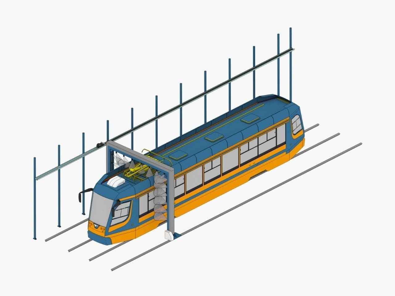 Данное устройство предназначено для проведения тестов на водонепроницаемость полностью собранных трамвайных кабин в соответствии с ОСТ 37.001.248-86. В процессе испытаний проверяются герметичные свойства следующих участков: