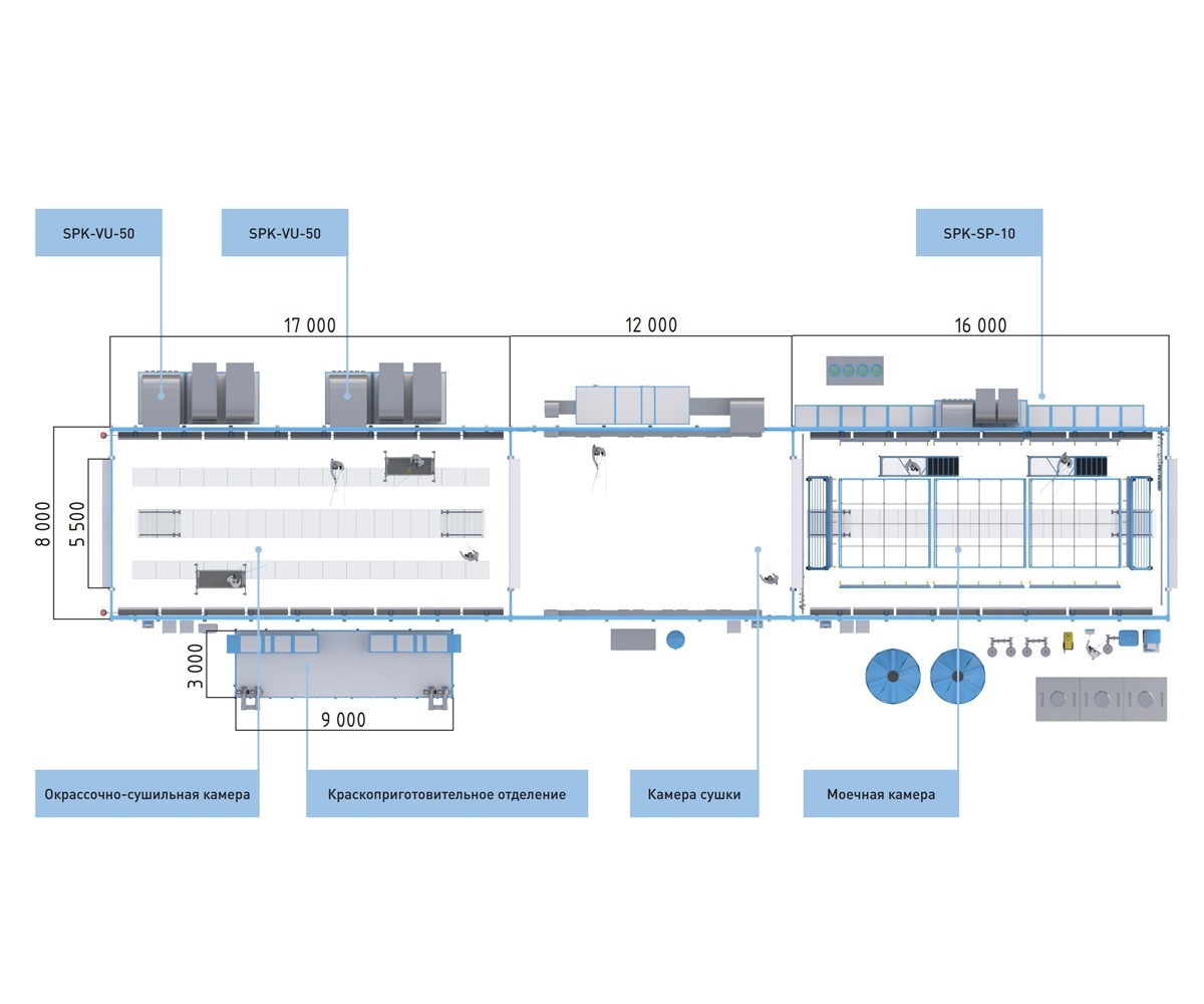 В составе комплекса расположены проходные камеры, предназначенные для мойки, сушки, финальной выдержки и окраски автомобилей.