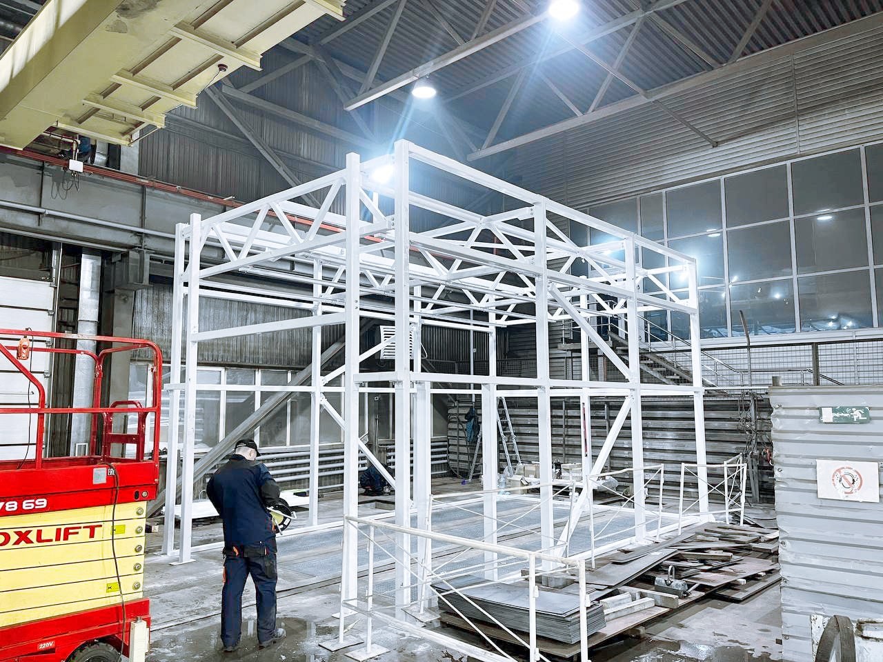 На площадке «Сиб-Дамель» началась сборка окрасочно-сушильной камеры. В скором времени в ней начнется финальная обработка узлов горно-шахтного оборудования, предназначенного для угольных предприятий Кузбасса. Пока это лишь металлический каркас, однако он уже рассчитан на серьезные задачи:
