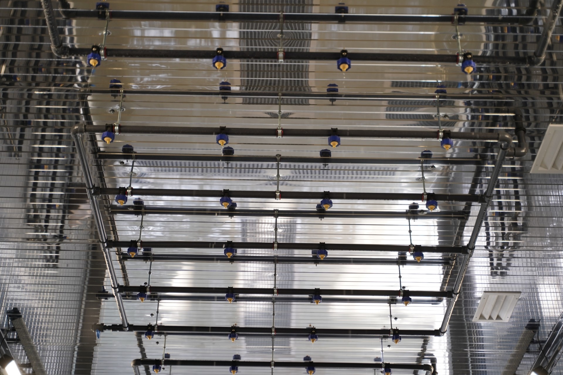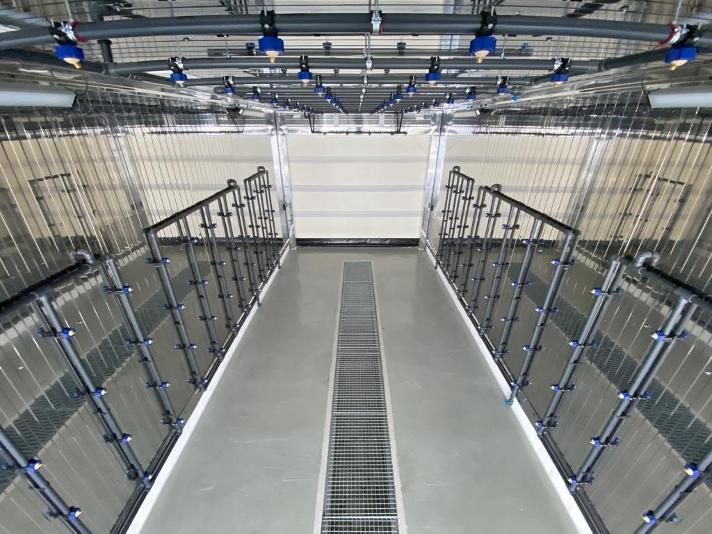 Дождевые форсунки монтируют вдоль боковых стен и на крыше кабины, закрепляя их в рамках внутри помещения. Трубный контур изготавливают из ПВХ-материала, а угол распыла равен 90°. Вода проходит через систему механической фильтрации перед подачей на форсунки.