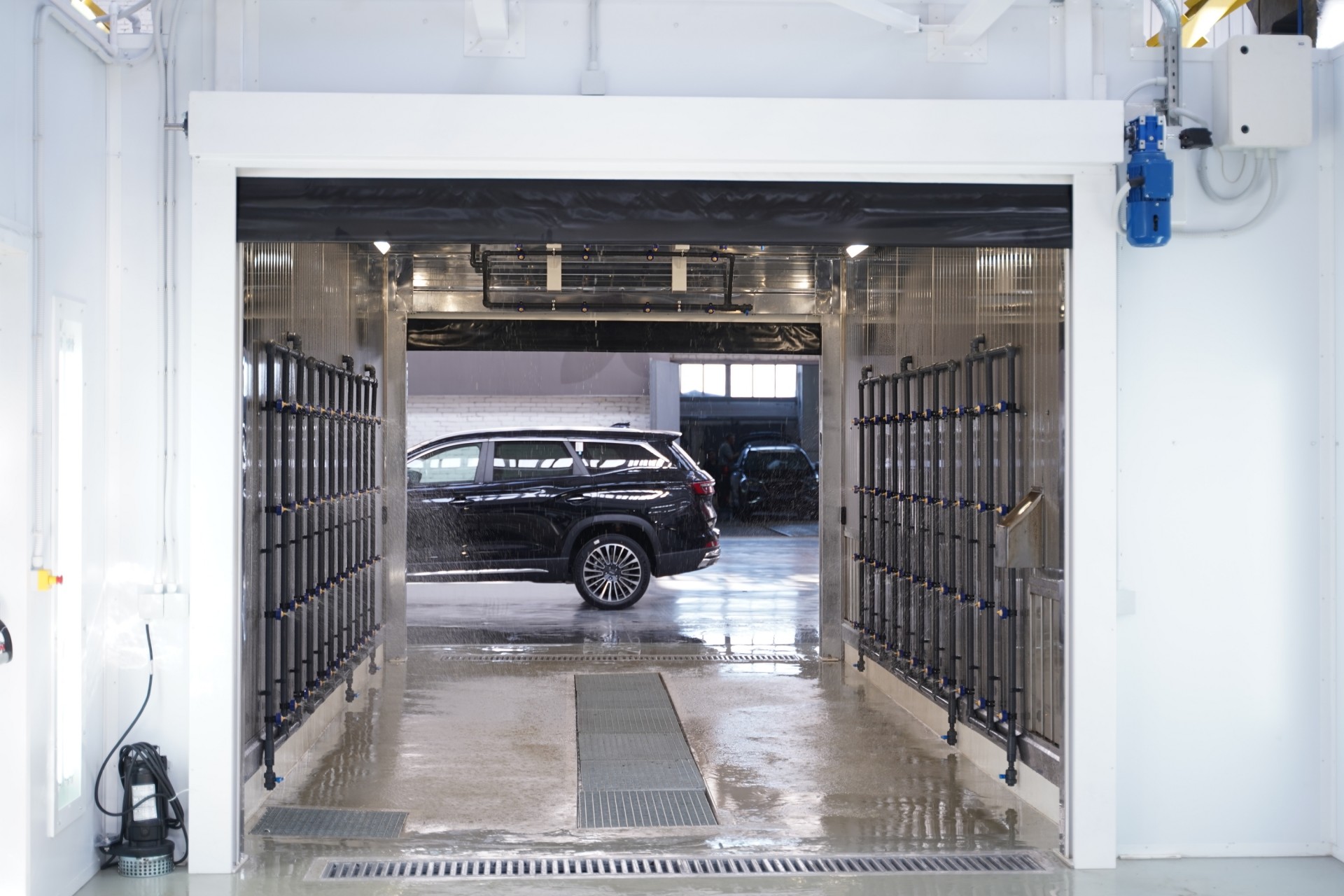 Ворота камеры управляются автоматически: установлены датчики, которые не позволят закрыть их, пока автомобиль не пройдет внутрь. После подъезда внутрь кабины ворота закрываются, начинается дождевание, а по окончании — ворота автоматически открываются. При необходимости включается вентиляция, и автомобиль может перемещаться на зону обдува или для осмотра. Все операции можно выполнять дистанционно с помощью специального пульта.