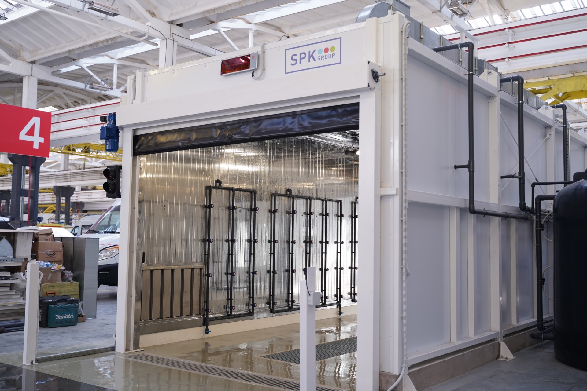 Размеры камеры дождевания SPK P-7.4.3 уточняются на стадии проектирования и при размещении оборудования. Обычно кабина включает одну секцию длиной около семи метров, высотой три метра и шириной четыре метра. В такой камере смогут разместиться автомобили размером от 3595х1595х1485 мм до 5180х1915х1891 мм.