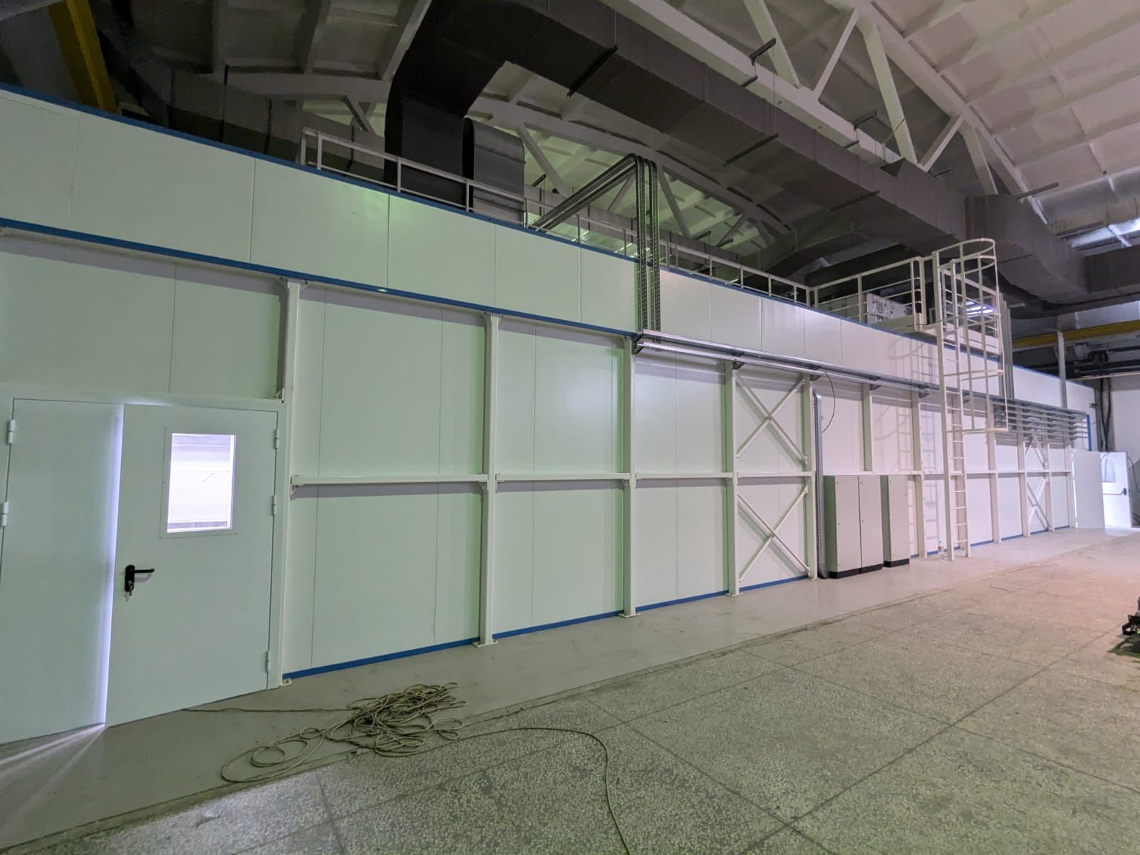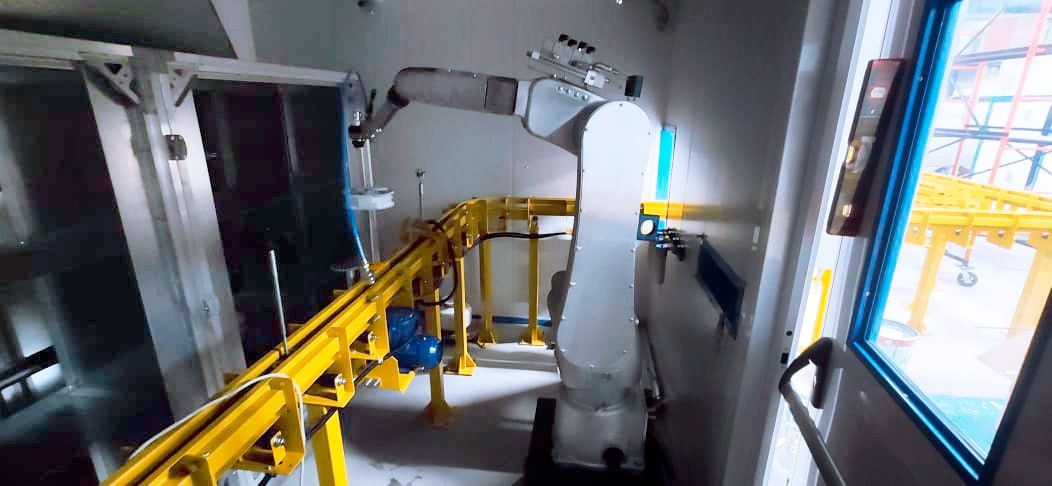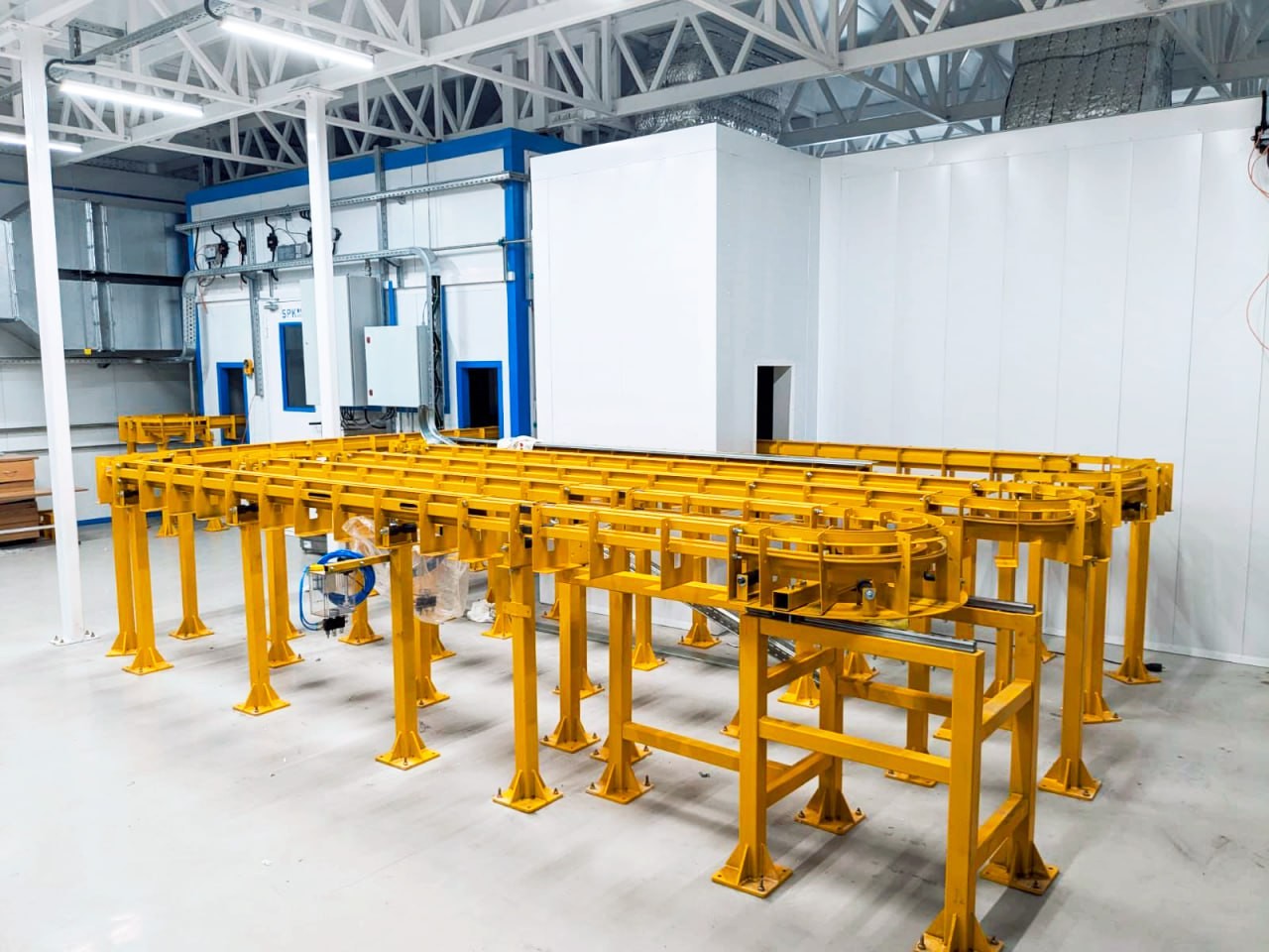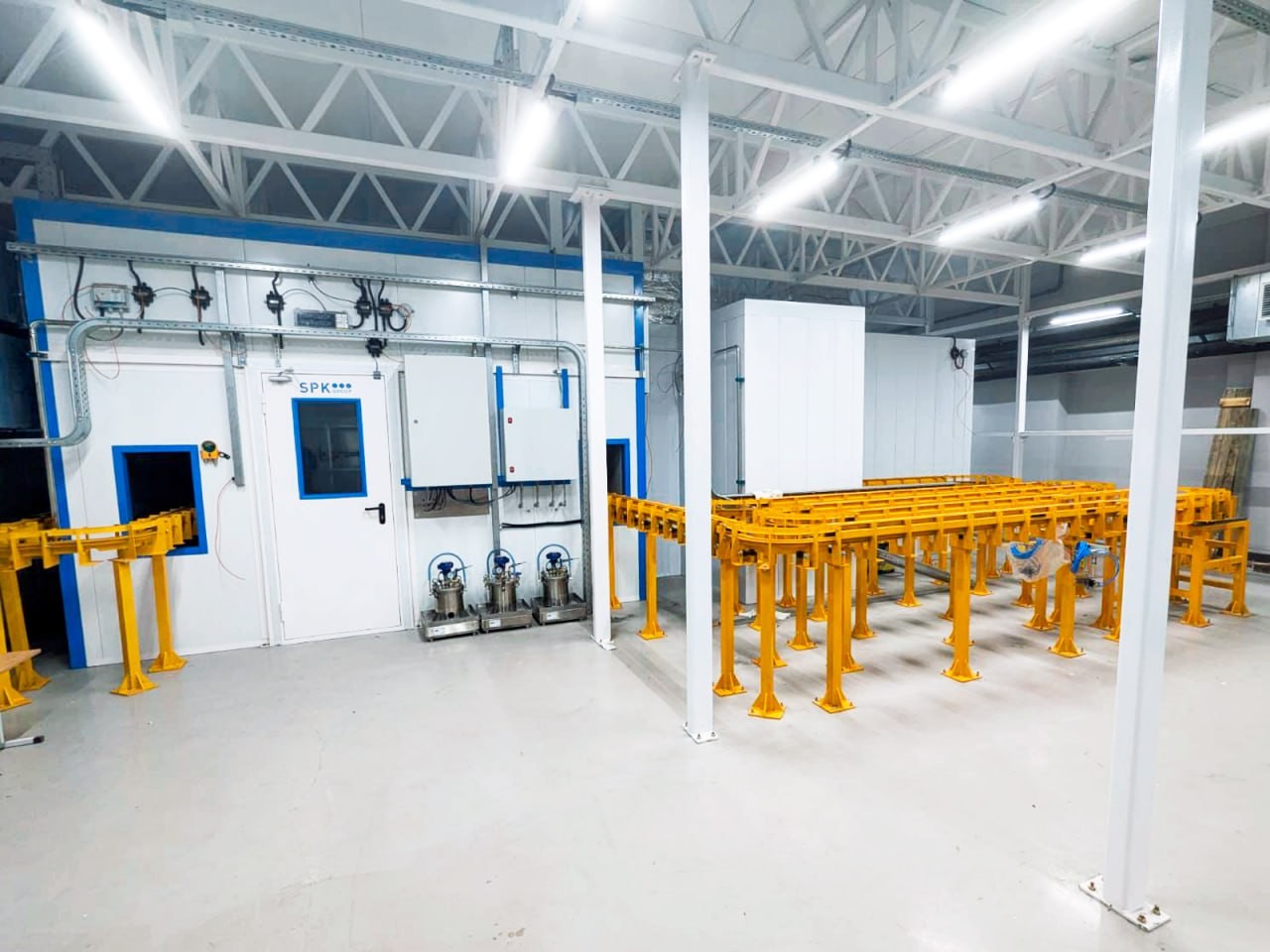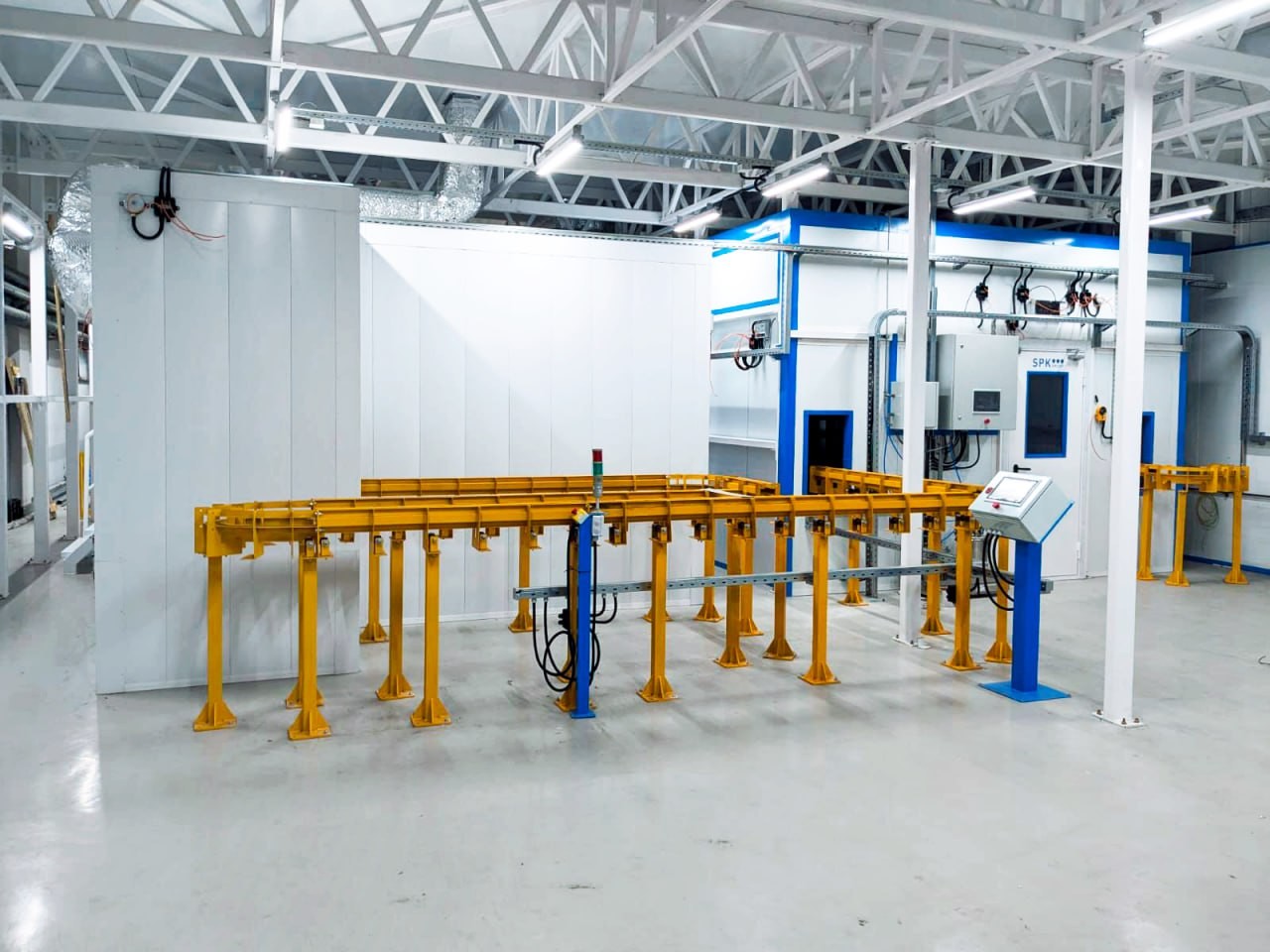 Комплект оборудования для линии включает: общую чистую камеру, двухсекционную роботизированную систему для окраски, установку для приготовления краски, камеру для сушки, напольный тактовый конвейер и полуавтоматический станок для окраски плоских деталей.
