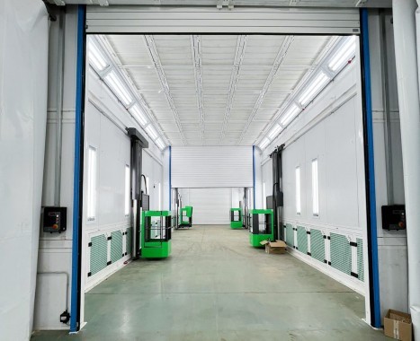 - Камера окрашивания: проходная обитаемая камера состоит из 2 секций. Размер камеры 5000 х 2700 х 3000 мм. В первой секции установлены промышленные окрашивающие роботы Fanuk LR10iA, во второй секции производится ручное окрашивание труднодоступных участков заготовок.