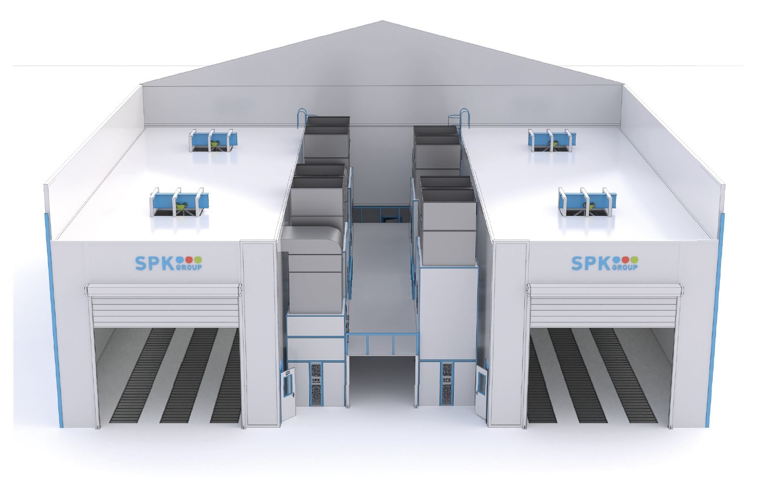Двухсекционная уличная окрасочно-сушильная установка модели SPK-SCB-26.24.10 (в дальнейшем — ОСК) предназначена для подготовки изделий к окраске, нанесения лакокрасочных покрытий и их последующей сушке при повышенных температурах. Внутри камеры создается стабильный поток фильтрованного и прогретого воздуха, движущегося с верхней части вниз, что обеспечивает высокое качество нанесения слоев и равномерную сушку. Система сухой фильтрации воздуха эффективно удаляет остатки краски и загрязнения, создавая благоприятные условия для нанесения лакокрасочных материалов без необходимости дополнительных очистных установок.