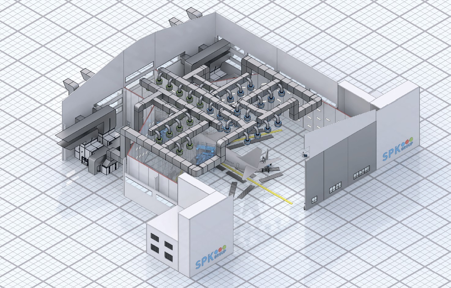 В число основного технологического оборудования входят шесть окрасочных приточно-вытяжных агрегатов SPK-VU-75 с компрессорно-конденсаторными блоками и применением хладагента. Система включает утеплённые воздуховоды, более ста ламинарных сопел с регулируемыми клапанами, клапаны для разделения потоков воздуха по зонам, специализированные решетки для сбора стоков и вытяжки, фильтрационные стены, оборудование для подготовки деминерализованной воды, локальные очистные сооружения и комплекс автоматики, включая частотные преобразователи, датчики и сенсорную панель с программным обеспечением SPK-PaintManager.