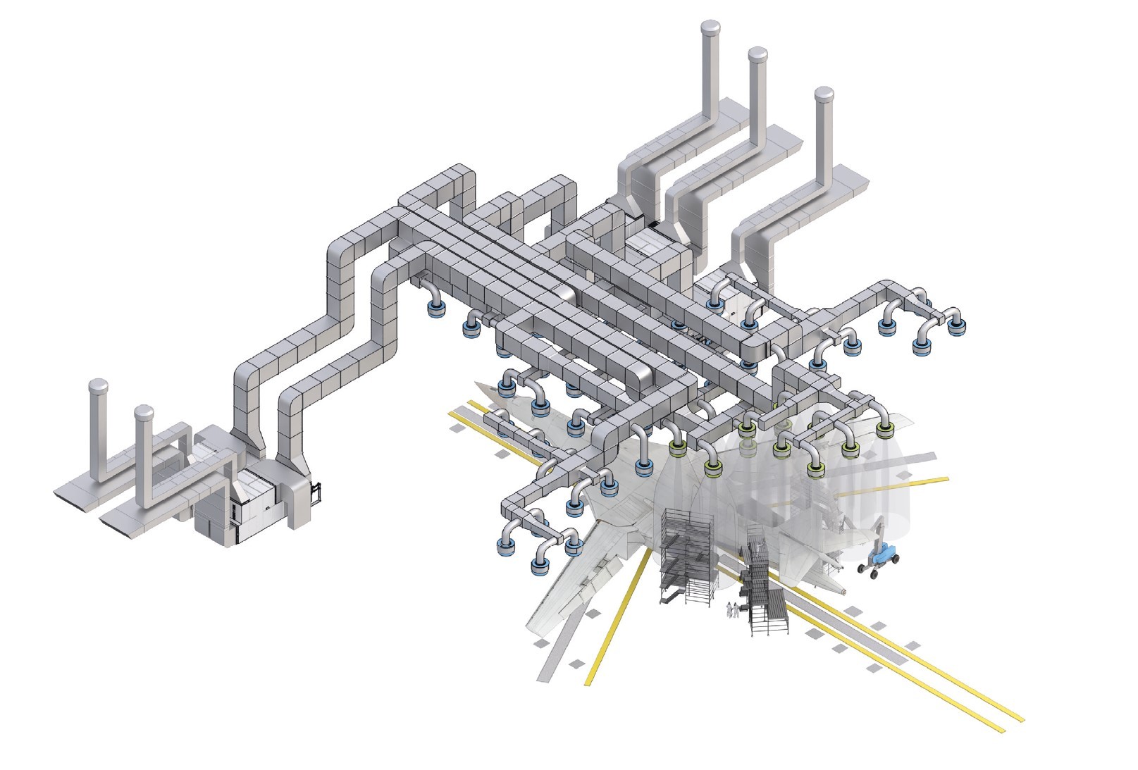 Основное технологическое оборудование представлено шестью приточно-вытяжными установками SPK-VU-75, оснащёнными компрессорно-конденсаторными блоками с хладагентом, утеплёнными воздуховодами, свыше сотни ламинарных форсунок с регулируемыми заслонками, воздушными клапанами для зональной подачи, специализированными решётками для вытяжки и дренажа, фильтрационными стенами, станцией подготовки деминерализованной воды, локальными станциями очистки стоков и автоматикой — частотными регуляторами, датчиками и сенсорной панелью с ПО SPK-PaintManager.